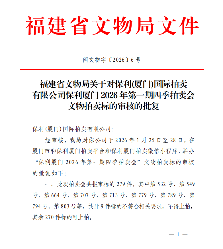福建省文物局关于对保利(厦门)国际拍卖有限公司保利厦门2026年第一期四季拍卖会文物拍卖标的审核的批复