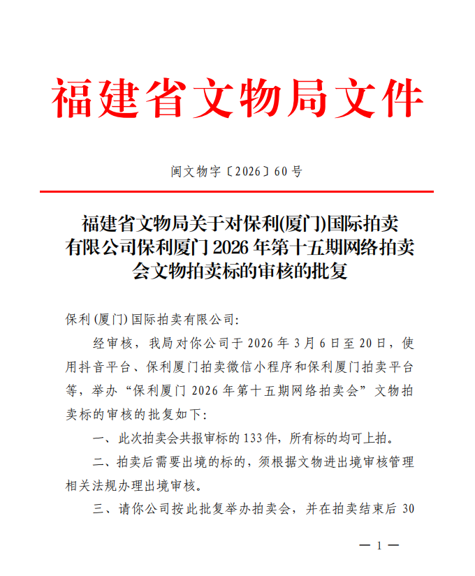福建省文物局关于对保利(厦门)国际拍卖有限公司保利厦门2026年第十五期网络拍卖会文物拍卖标的审核的批复
