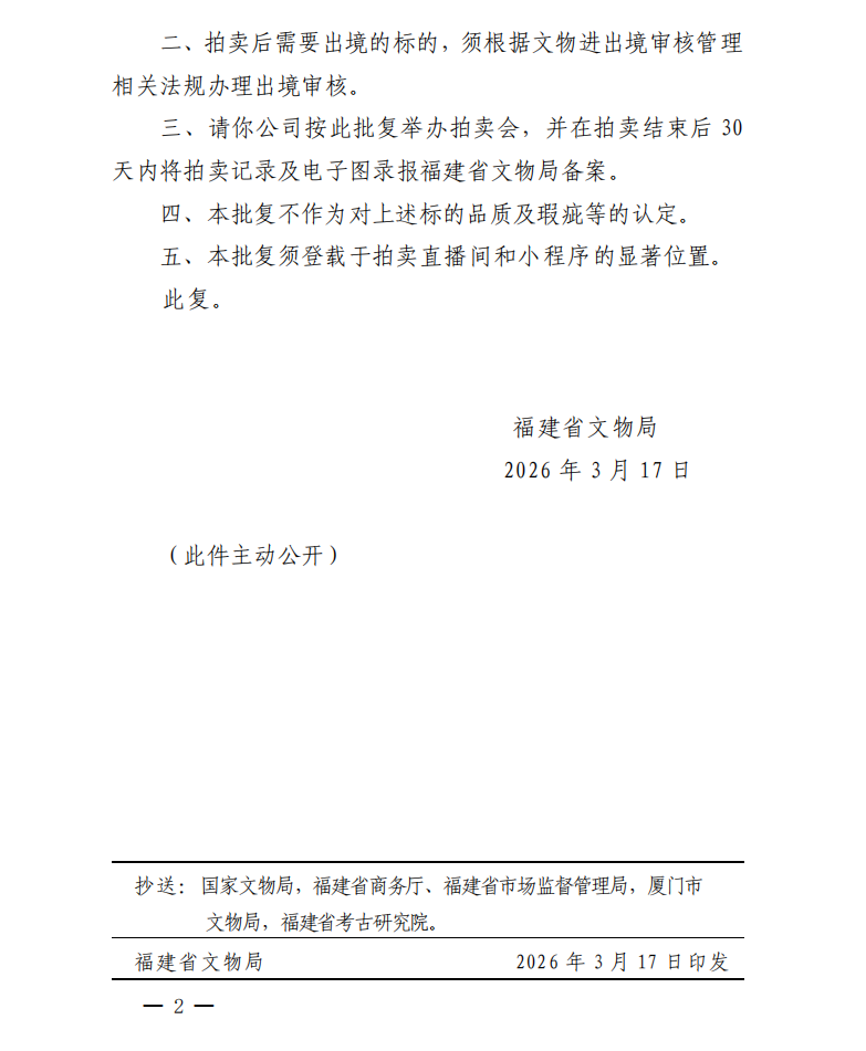 福建省文物局关于对保利(厦门)国际拍卖有限公司保利厦门2026年第十九期网络拍卖会文物拍卖标的审核的批复